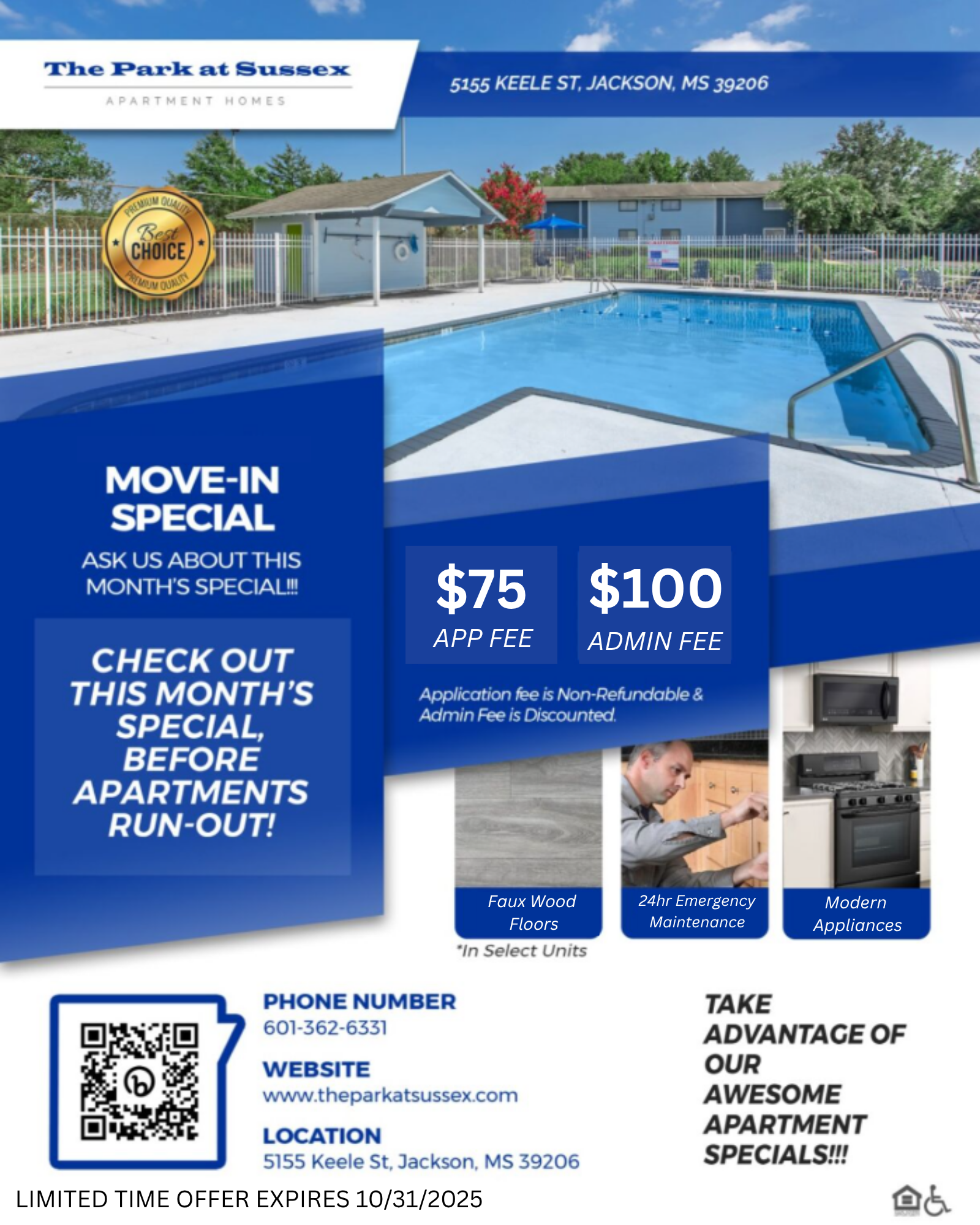 Discover apartment home living at its finest in Jackson, Mississippi, right here at The Park at Sussex! We are perfectly situated in a serene neighborhood with a small-town vibe and close enough to all the fun and excitement that North Jackson has to offer. You will have easy access to all the entertainment hot spots, delicious restaurants, and fabulous shopping. With all the nearby conveniences, you will be proud to call The Park at Sussex home.